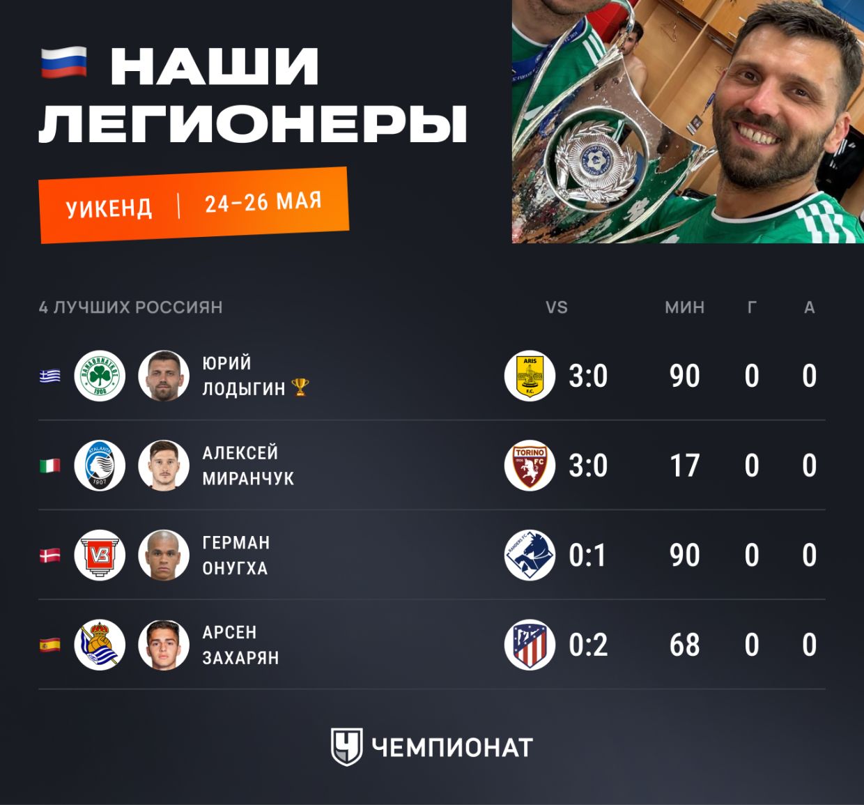Российские полузащитники Магомед Оздоев (ПАОК) и Егор Пруцев («Целе») завершили сезон неделей ранее в статусе чемпионов, соответственно, Греции и Словении. Закончился сезон также у Александр Головина («Монако», Франция), Александра Кокорина («Арис», Кипр), Григория Морозова («Бейтар», Израиль), Ивана Злобина («Фамаликан», Португалия) и почти не игравшего из-за травм Станислава Крицюка («Жил Висенте», Португалия).
