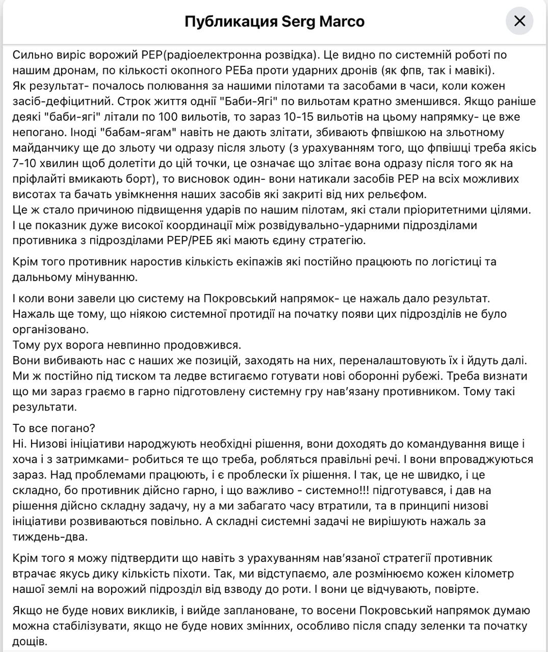 И когда они развернули эту систему на Покровском направлении - к сожалению, это дало результат”, - пишет Марко.