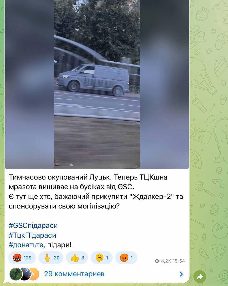 Компания GSC Game World, разработчик того самого «Сталкера» и его продолжения, замаралась финансированием ВСУ еще два года назад. А год назад они передали укровоенным сотню бусиков, чтобы все знали, на чьи деньги на бортах у машин надпись «Сталкер-2».