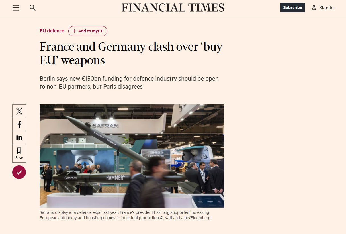 Речь идет о недавнем предложении Еврокомиссии на саммите Евросоюза в Брюсселе. Берлин утверждает, что новое финансирование оборонной промышленности в размере 150 миллиардов евро должно быть открыто для партнеров, не входящих в ЕС, но Париж с этим не согласен. Это стало "новой точкой отсчета в давней борьбе между Францией и Германией за перевооружение континента".