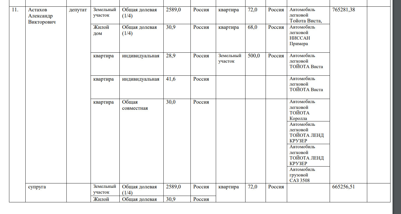 Кроме того, депутат владел четырьмя автомобилями. Грузовик САЗ 3508 сегодня вряд ли может числиться активом, Toyota Vista в 2023 году была продана под восстановление в городе Заринске Алтайского края (согласно базам данных страховщиков, Александр Астахов был владельцем только одного автомобиля такой марки, и скорее всего, декларация содержит ошибки), но еще две машины до сих пор в тех же базах страховщиков числятся собственностью Александра Викторовича.
