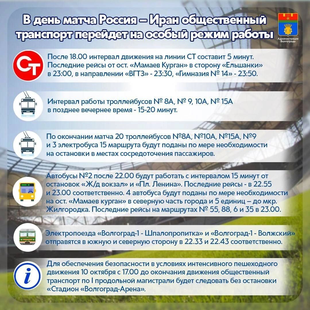 После игры также усилят работу общественного транспорта и в соседнем Волжском. Так, болельщики смогут добраться из одного города в другой на электричке. Поезд прибудет в Волжский в 23:15. А с вокзала его пассажиры смогут пересесть на два автобуса, которые поедут в 23:20: №2у до остановки «37 микрорайон» и №14 до «37 микрорайона».