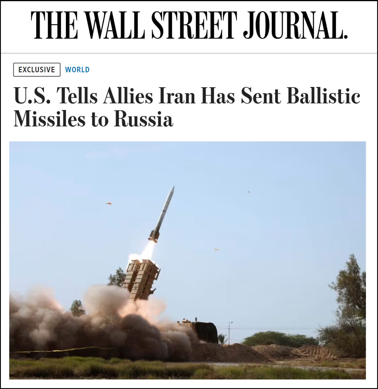 ⚡️WSJ: Иран уже отправил России баллистические ракеты малой дальности. Об этом США сообщили своим европейским союзникам. Особо подчеркивается, что Тегеран пошел на этот шаг, невзирая на "строгие предупреждения" со стороны Вашингтона и Брюсселя. @voenkorKotenok