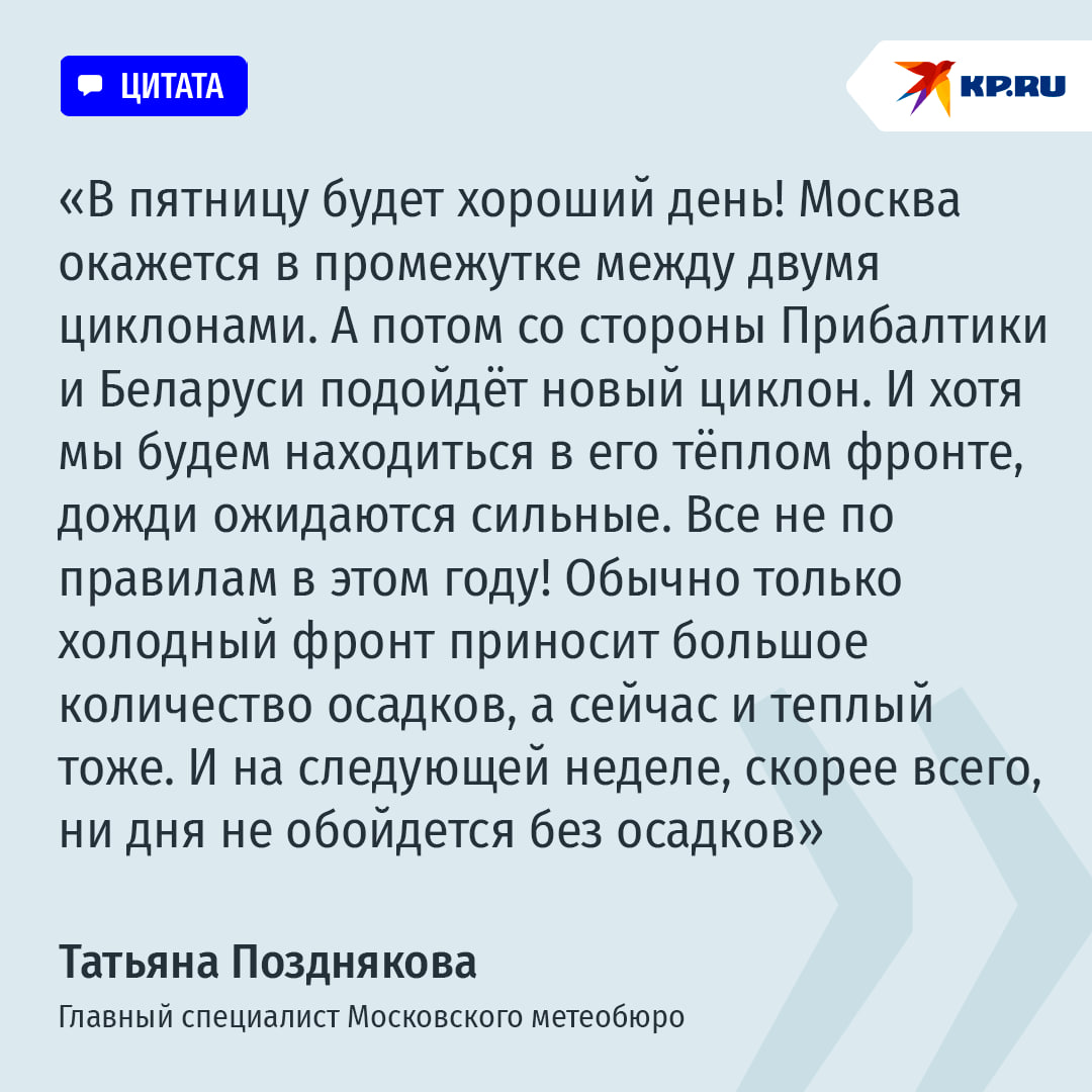 Ненастье сделает перерыв лишь на один день - собственно, уже сегодня, в пятницу, 18 июля. Хотя на юге Подмосковья все же есть риск коротких грозовых дождей, в столице и других районах области наконец-то будет сухо. И очень тепло, +27…+29 градусов. А в выходные - опять ливни с громом и молниями! В субботу +26…+28 градусов, в воскресенье +24…+26. За два дня, по расчетам центра «Фобос», выльется 40% месячной нормы осадков - то есть около 35 мм, или по 3,5 ведра воды на каждый квадратный метр.