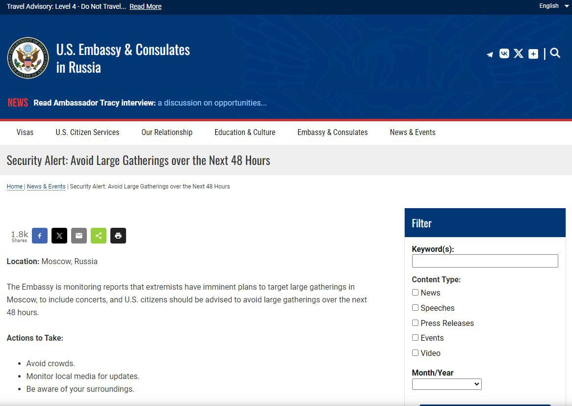 Посольство США сообщило, что в ближайшие 48 часов в Москве неназванные экстремисты планируют атаки. Граждан США просят избегать больших скоплений людей.
