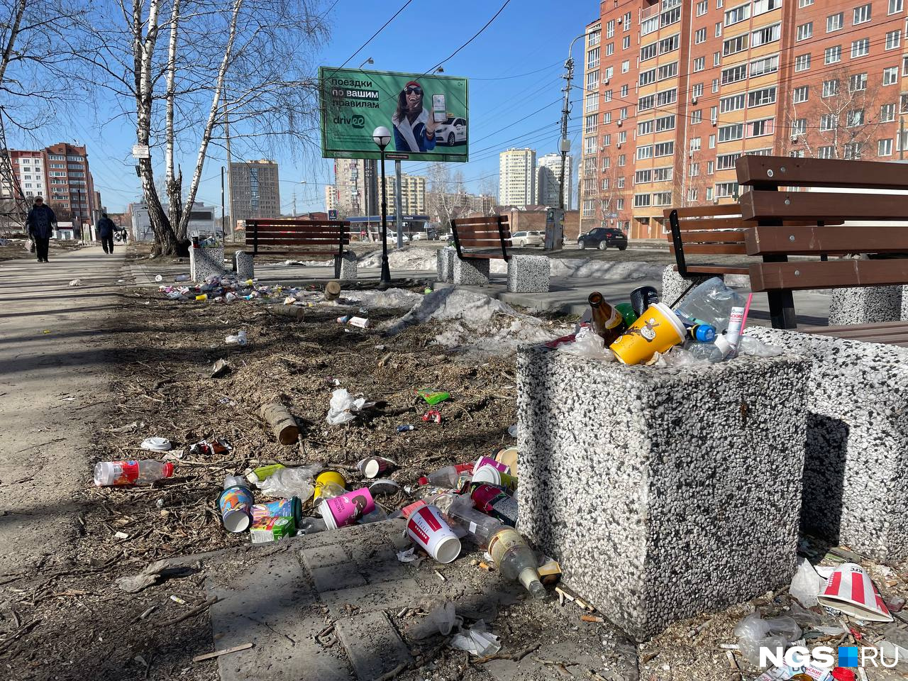 Дополняет пейзаж мусор, который, судя по его количеству, минимум несколько дней сбрасывали у скамеек в нескольких метрах от остановки «НГПУ». Здесь есть и пластиковые стаканы, и стеклянные бутылки из-под напитков, и множество пакетов и упаковок. Если бы кто-то захотел начать сортировать мусор, то можно было бы успешно поучиться на таком тренажере.