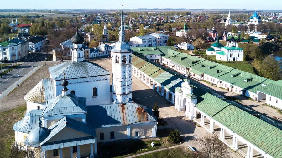 Третий символ Суздаля — это, пожалуй, торговые ряды, которые до сих пор остаются торговыми рядами. Они построены в годы Наполеоновских войн, которые, к счастью, прошли мимо Суздаля, по проекту архитектора Алексея Вершинского. Колонны, башенки — сдержанная красота русского ампира.