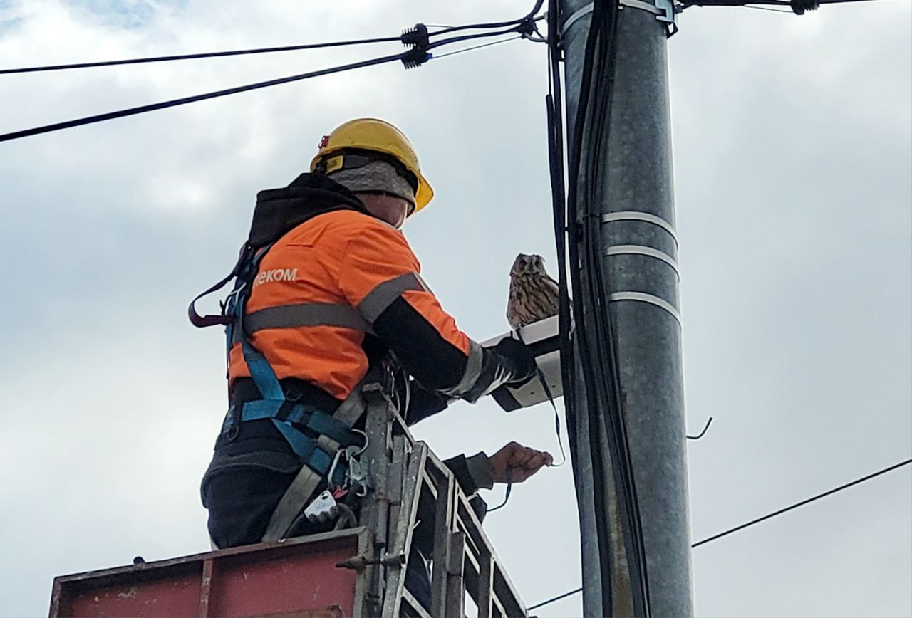 Связисты смогли распутать зацепившийся за камеру поводок и спустить птицу. Сова была спасена, ее передали зоозащитникам.