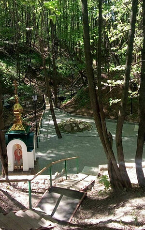 Еще рассказывают на Ваду, в ближайшей деревне Елховке и других окрестных селах и деревнях, что батюшка Серафим Саровский шел однажды на Зеленогорскую ярмарку. Дивеевским сестрам что-то по их надобности купить. Жарко было, пить ему хотелось. Помолился батюшка и глядит – стоят на краю овражка двенадцать апостолов и держат воду в пригоршнях. Спустился преподобный в овраг и увидел, что забили из земли ключики.