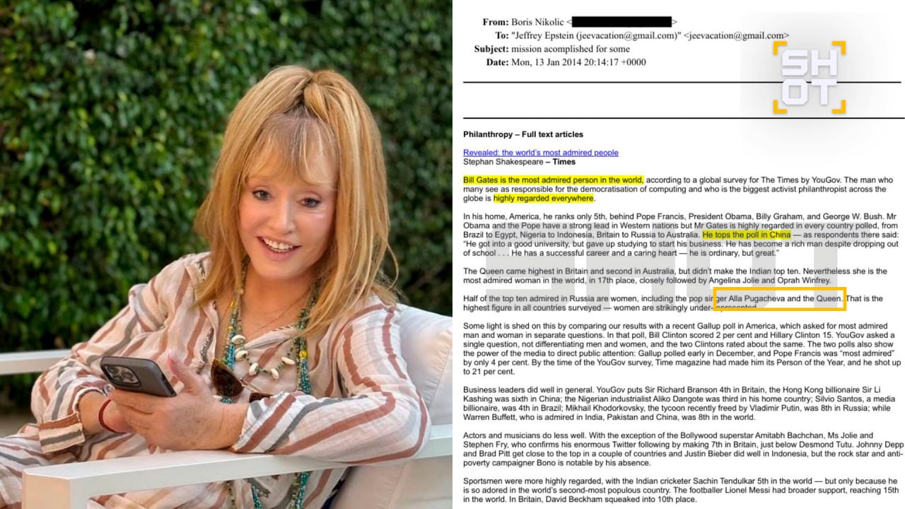 Как стало известно SHOT, Пугачёва засветилась в файлах как «самая популярная женщина России», с которой обязательно нужно встретиться Эпштейну. Такое письмо под кодовым названием «Миссия выполнена для некоторых» американскому финансисту отправил Борис Николич — бывший советник Билла Гейтса. Он проанализировал самых известных женщин и составил их список, чтобы те приехали к Эпштейну. Но самому финансисту Пугачёва не понравилась, поэтому её отсеяли и не пригласили танцевать не позвали на вечеринки. В 2014 году, когда было отправлено письмо, Примадонна заняла вторую строчку в опросе «Женщина года», уступив лишь Ани Лорак.