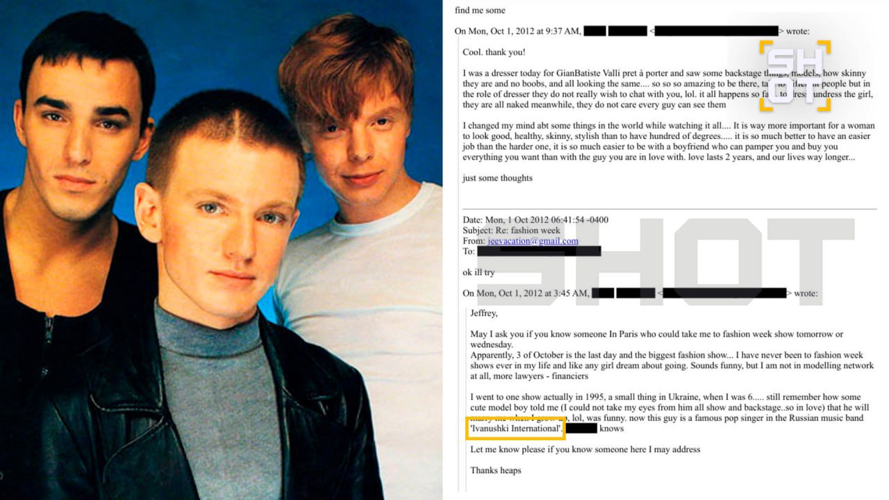 Группа «Иванушки» тоже угодила в «файлы Эпштейна» не в лучшем свете. Одна из девушек финансиста поделилась с ним увлекательной историей, которая приключилась с ней в 1995 году на концерте. 24-летний парень-модель из России, от него она не могла оторвать глаз на протяжении всего шоу, заприметил её. Подошёл и заявил, что женится на ней, когда та повзрослеет. Девчонке на тот момент было всего 6 лет. Через пару месяцев загадочный «мужчина-модель» стал участником группы «Иванушки International». Им оказался бессменный солист Кирилл Андреев (на фото слева).
