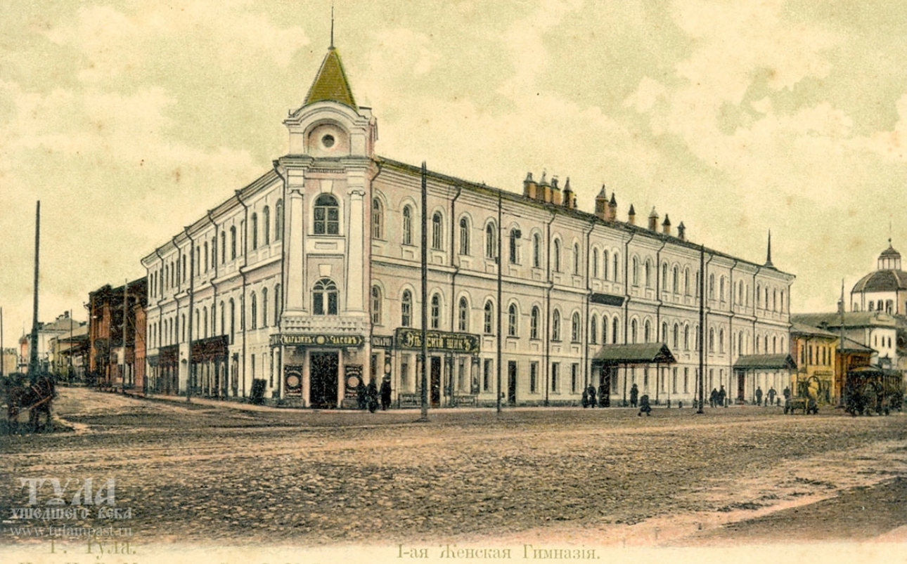 В 1859 году в специально построенном здании было открыто женское училище 1-го разряда. В 1870 году его преобразовали в гимназию, а с 1899 года стали называть «Первой Тульской женской гимназией». Сначала в здании был только один учебный корпус, но в 1902 году его расширили до улицы Жигалинской (сейчас Союзная) и надстроили третий этаж. На верхних этажах располагались классы, актовый и гимнастический залы, а также комнаты для иногородних учениц.