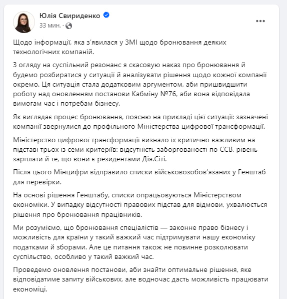 «Будем разбираться в ситуации и анализировать решения по каждой компании отдельно [...] Министерство цифровой трансформации признало их критически важными на основе 3 из 7 критериев: отсутствие задолженности по ЕСВ, уровень заработной платы и то, что они являются резидентами Дія.Сіті»,