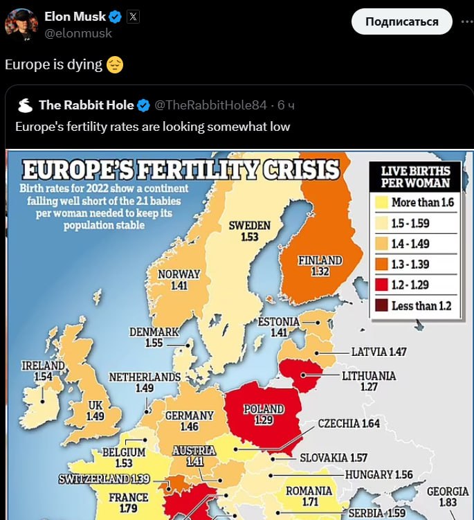 В соцсети X опубликовали инфографику с коэффициентами рождаемости: