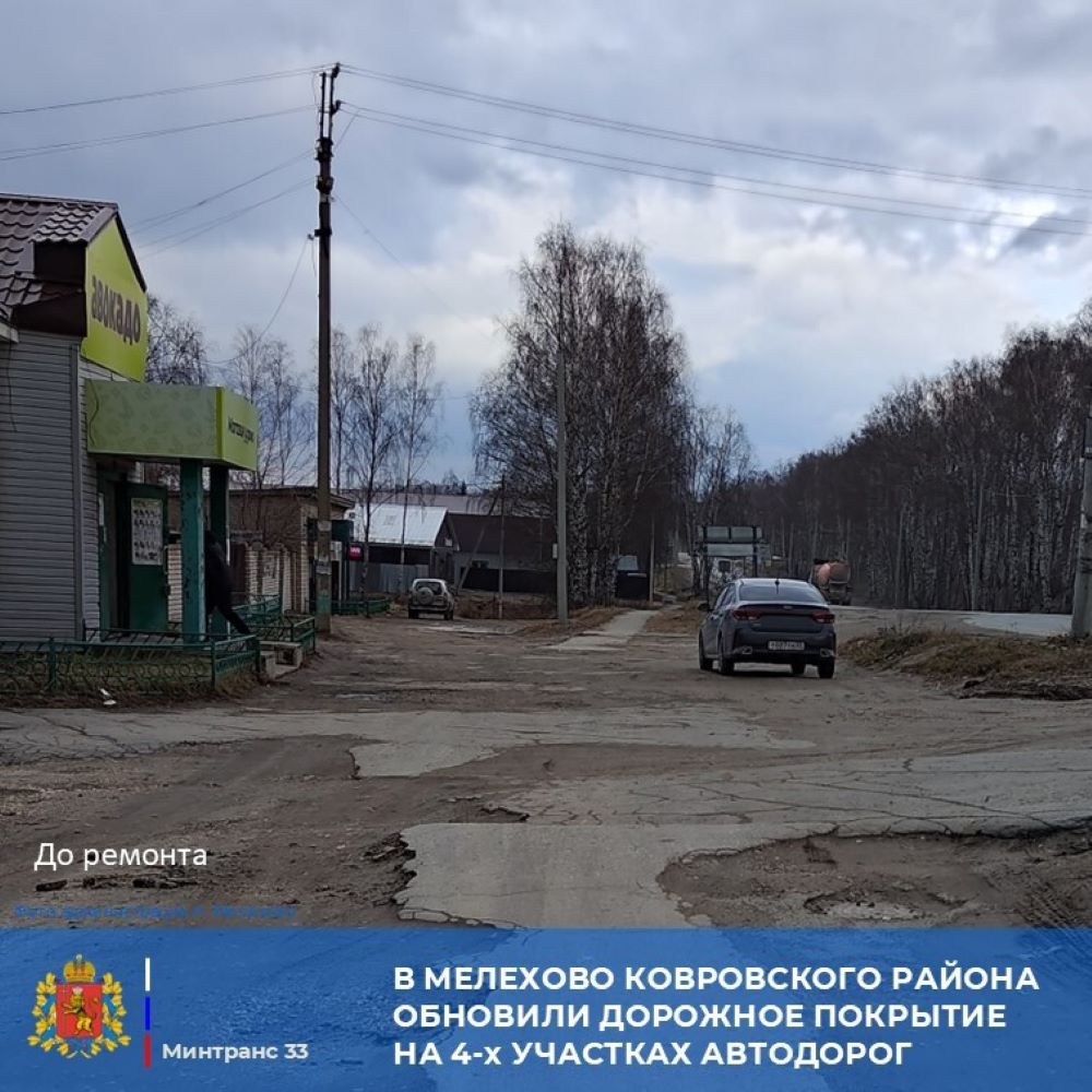 В посёлке Мелехово Ковровского района закончили реконструкцию четырёх внутрипоселковых отрезков протяжённостью около 700 метров. Под новый асфальт попали два участка улицы Первомайской и проезды № 15 и № 16.
