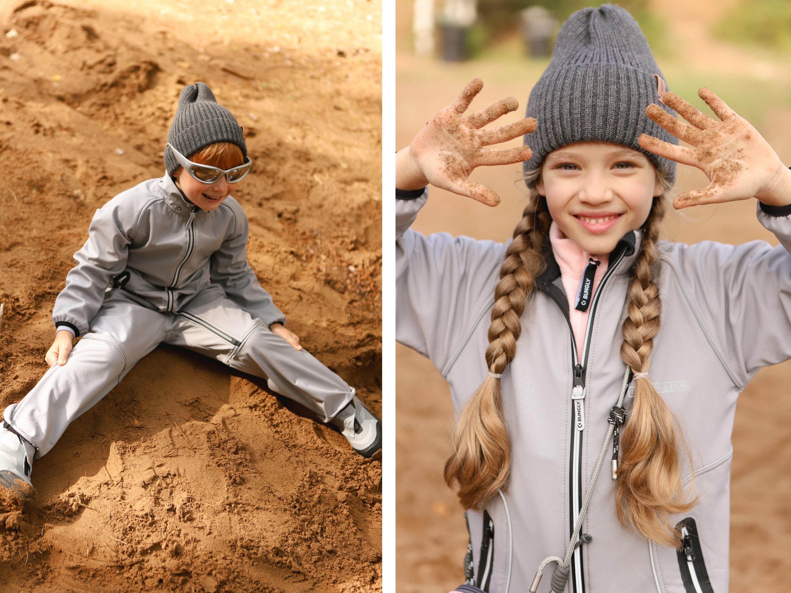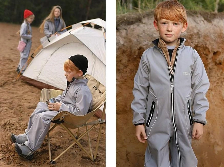 • Если ребенок любит активные прогулки и не сидит на скамейке, комбинезон — отличный вариант. Он закрывает спину, защищает от ветра, не задирается и не пропускает грязь внутрь. В коллекции BUNGLY TEC стоит обратить внимание на комбинезон «Туман»: его делают из качественной мембранной ткани нового поколения с улучшенным показателем 20000/10000, а швы дополнительно проклеивают, поэтому даже если ребенок сядет в мокрый песок, одежда останется сухой изнутри. Линейка также включает куртки «Туман» и брюки-палаццо, разработанные для ребят постарше.