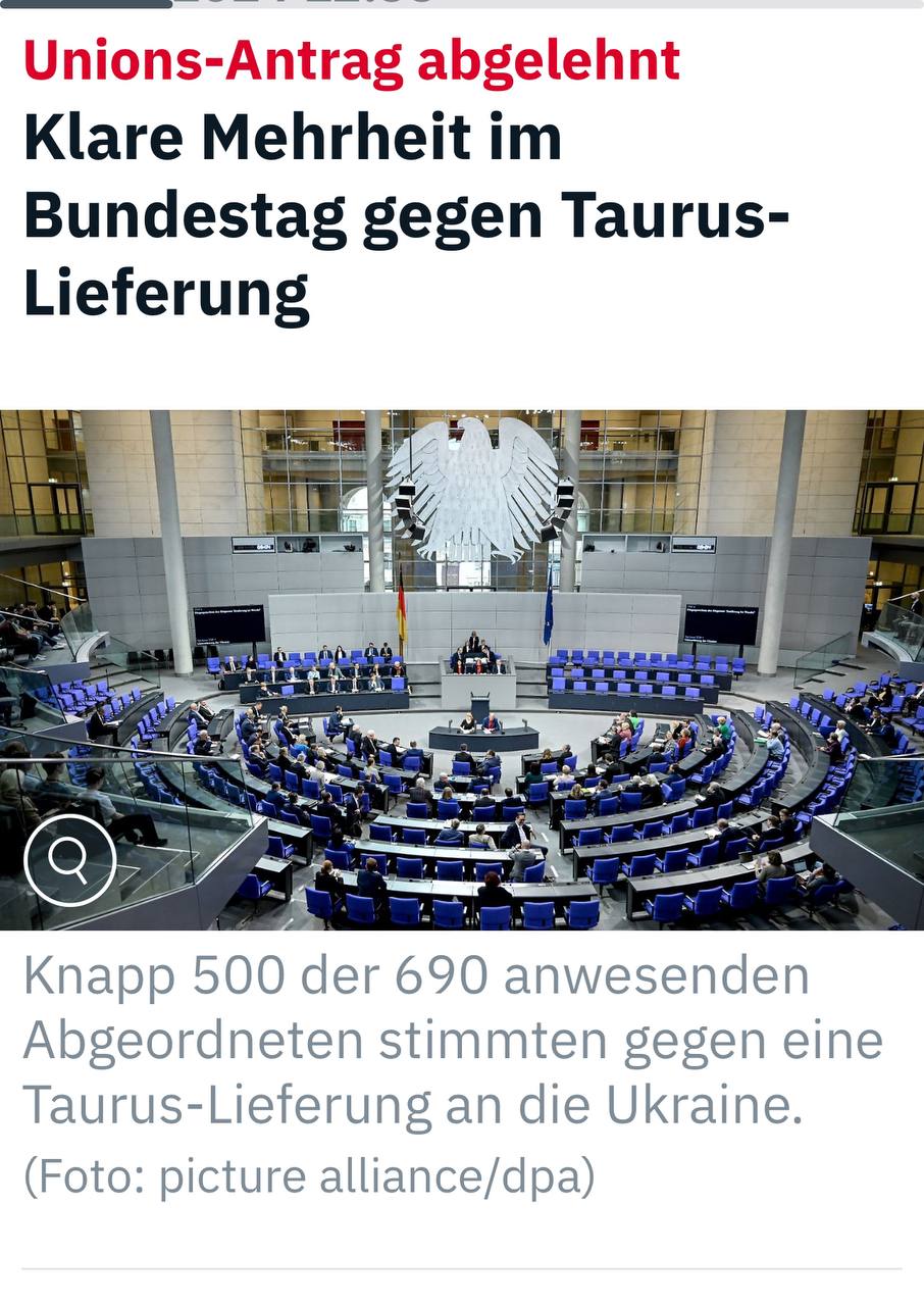 Бундестаг проголосовал против поставки ракет ТАУРУС. Новая попытка ХДС/ХСС протащить через парламент решение провалилась. 495 голосов против, только 190 - за. Причем семь депутатов из партии войны, проголосовали против поставок или воздержались. Скоро расскажу о том, что же знает про ТАУРУС канцлер Шольц , чего не знают его оппоненты. Эта деталь все объяснит. Уже скоро в моем тг-канале