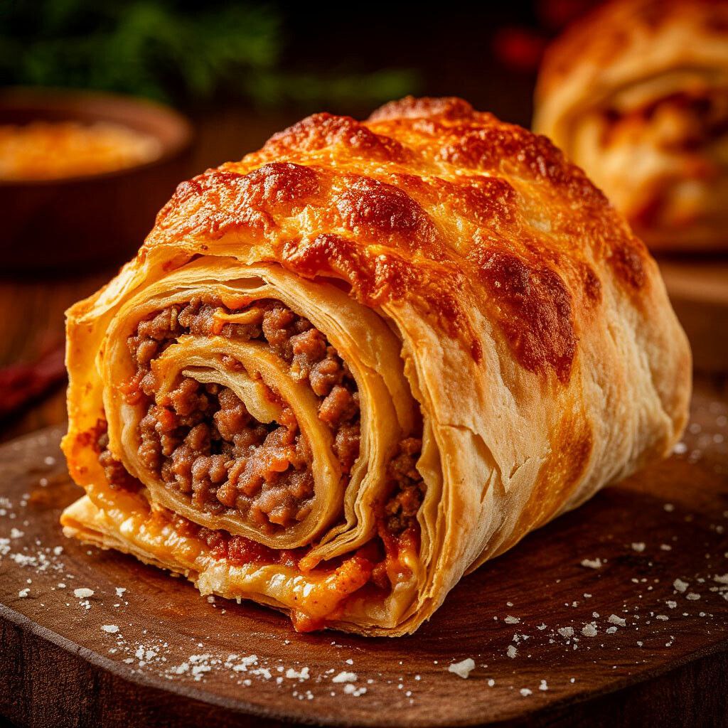 3․ Покройте лаваш тонким слоем фарша и сверните в плотный рулет. Выложите его на противень.