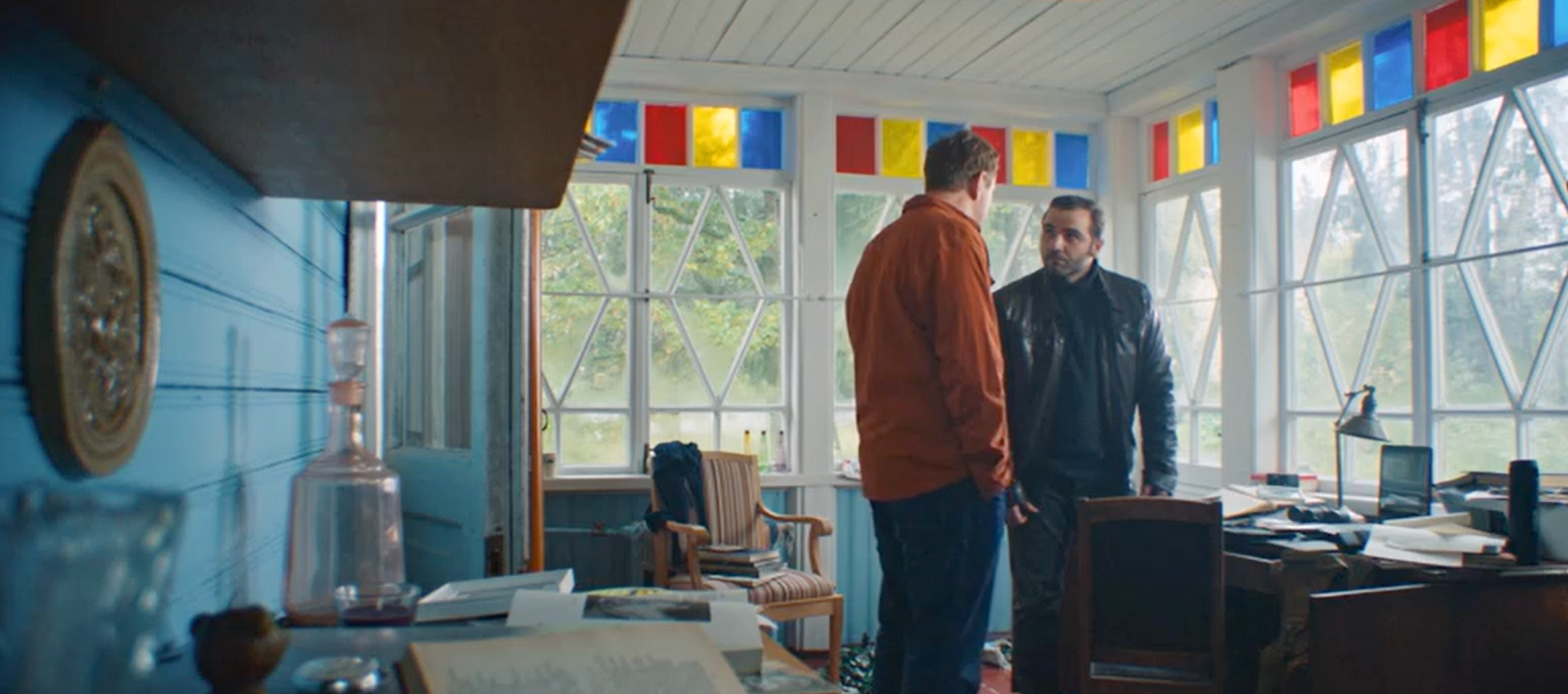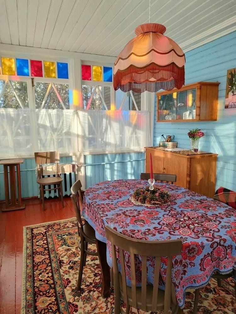 Отличительная черта этого дома — большая терраса с окнами, украшенными витражами синего, желтого и красного цвета. С потолка свисает красный абажур с бахромой и вся обстановка в доме говорит о той эпохе, когда он был построен — 1950-х.