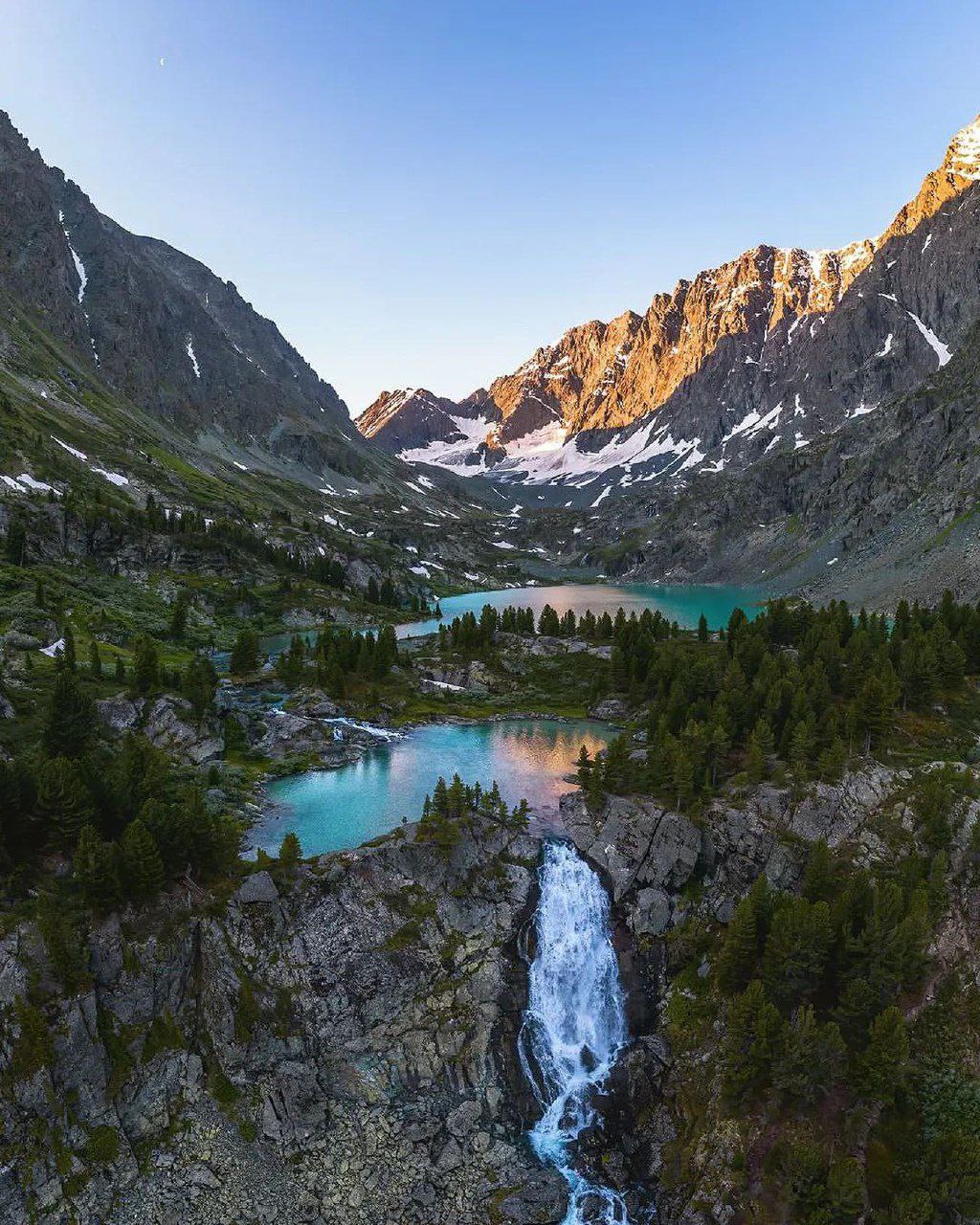 📸 Пологие берега не создают препятствий. Можно подойти вплотную к воде. Уникальная особенность Нижнего озера – выпадающий из него водопад. Верхнее озеро Куйгук находится чуть выше. Ландшафт здесь суровее: склоны окружающих гор круче, растительности мало, берега скалистые.