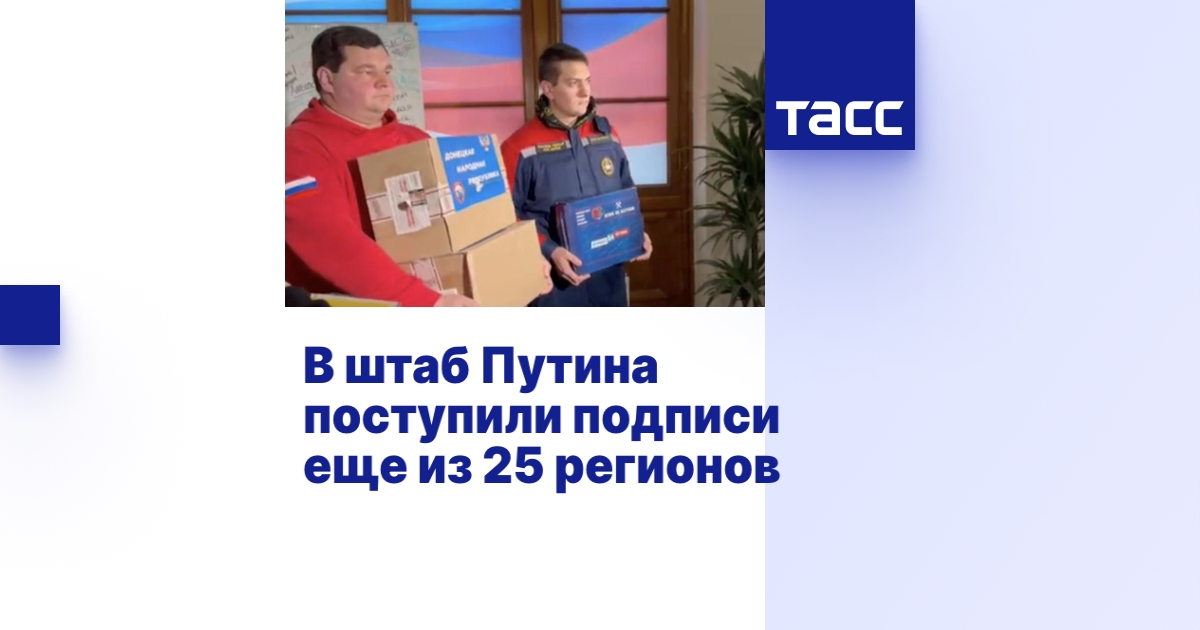 МОСКВА, 6 января. /ТАСС/. Подписи в поддержку самовыдвижения кандидата в президенты РФ, действующего главы государства Владимира Путина еще из 25 регионов, включая новые, поступили в его центральный избирательный штаб в Гостином дворе, передает корреспондент ТАСС.