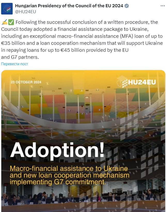 Совет ЕС 23 октября окончательно одобрил выделение Украине кредита в размере 25 млрд евро за счет налогов с прибыли от замороженных российских активов.