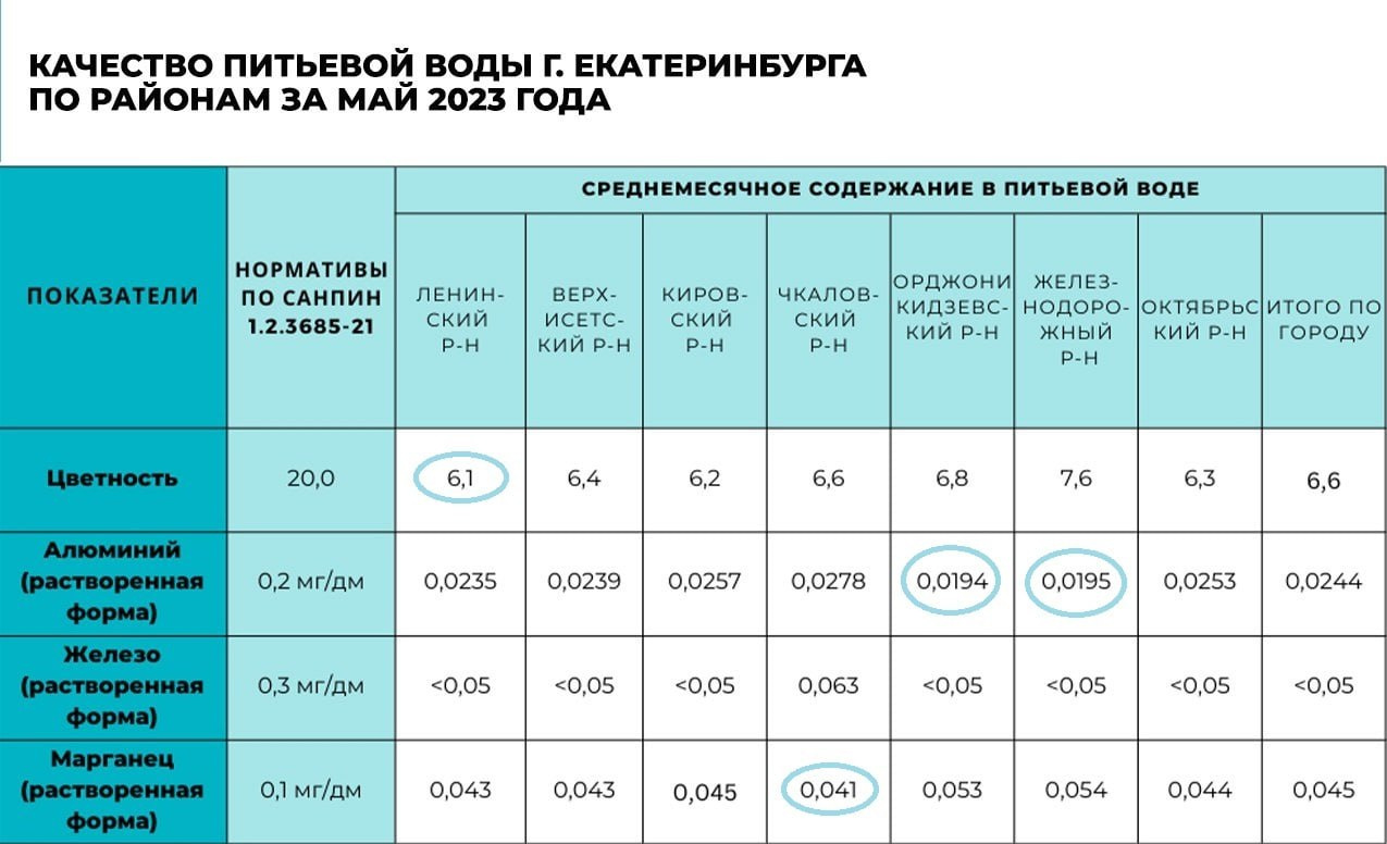 В целом по городу вода соответствует санитарным нормам и правилам, но по районам есть и антилидеры. Так, по показателю цветности воды хуже всего обстоят дела в Железнодорожном районе, больше всего алюминия нашли в воде в Чкаловском и Кировском районах, больше всего железа в растворенной форме в Чкаловском, а марганца — в Орджоникидзевском и в Железнодорожном районах.