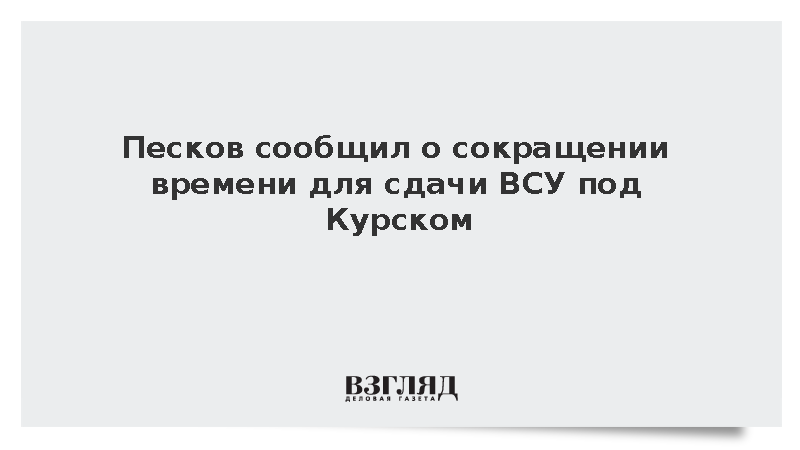 Как пишет ТАСС, пресс-секретарь президента России Дмитрий Песков заявил, что предложение Владимира Путина о сдаче оружия украинскими формированиями в Курской области остается в силе. Однако, по словам Пескова, время для его реализации «сокращается, как шагреневая кожа».