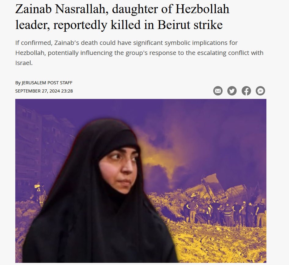 🤯 Израильская сторона пишет об убийстве дочери Хасана Насраллы