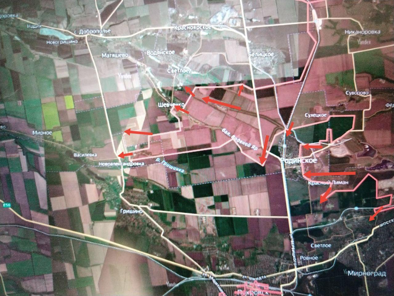 Наши подразделения продвинулись и северо-восточнее (на запад от Родинского), ведут бои за Шевченко, продвигаясь, обойдя Белицкое южнее, и к Светлому. На северном охвате Белицкого — бои за Новый Донбасс.