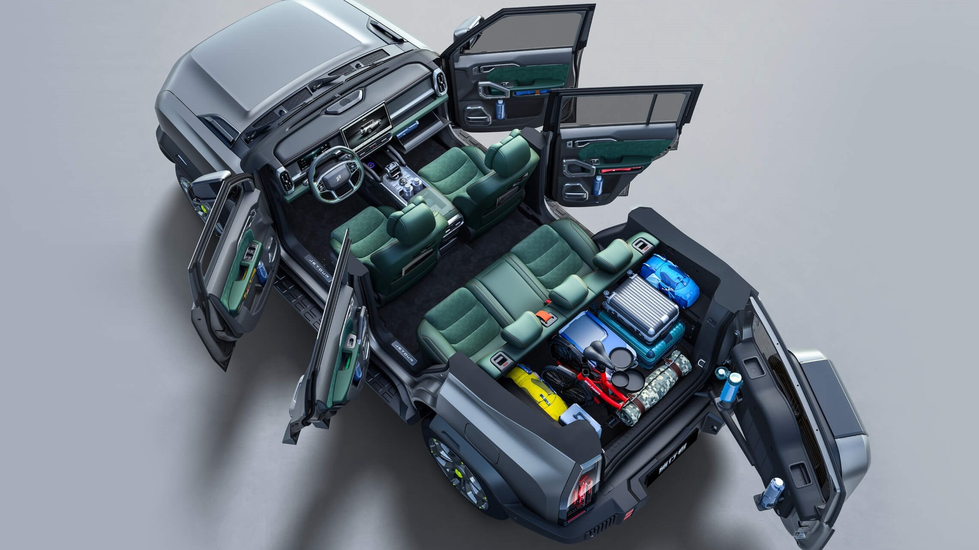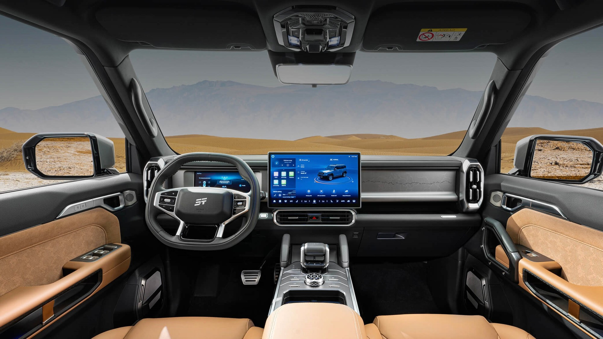 Салон у Jetour T2 оформлен в том же брутальном квадратно-гнездовом стиле, что и внешность. В прямоугольную переднюю панель вмонтирован 10,25-дюймовый экран, а по центру прикручен 15,6-дюймовый мультимедийный планшет, поддерживающий голосовое управление и смартфонные интерфейсы Apple CarPlay и Android Auto. Объём багажника при сложенных сиденьях второго ряда — 1494 л.