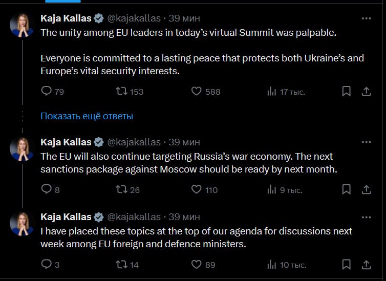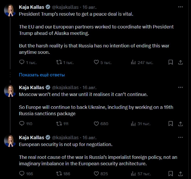 Глава дипслужбы ЕС Кая Каллас сообщила в 𝕏 о недоверии к России и продолжении антироссийской политики, включая новые санкции: