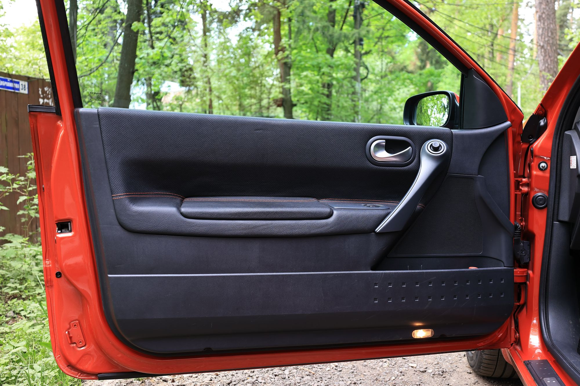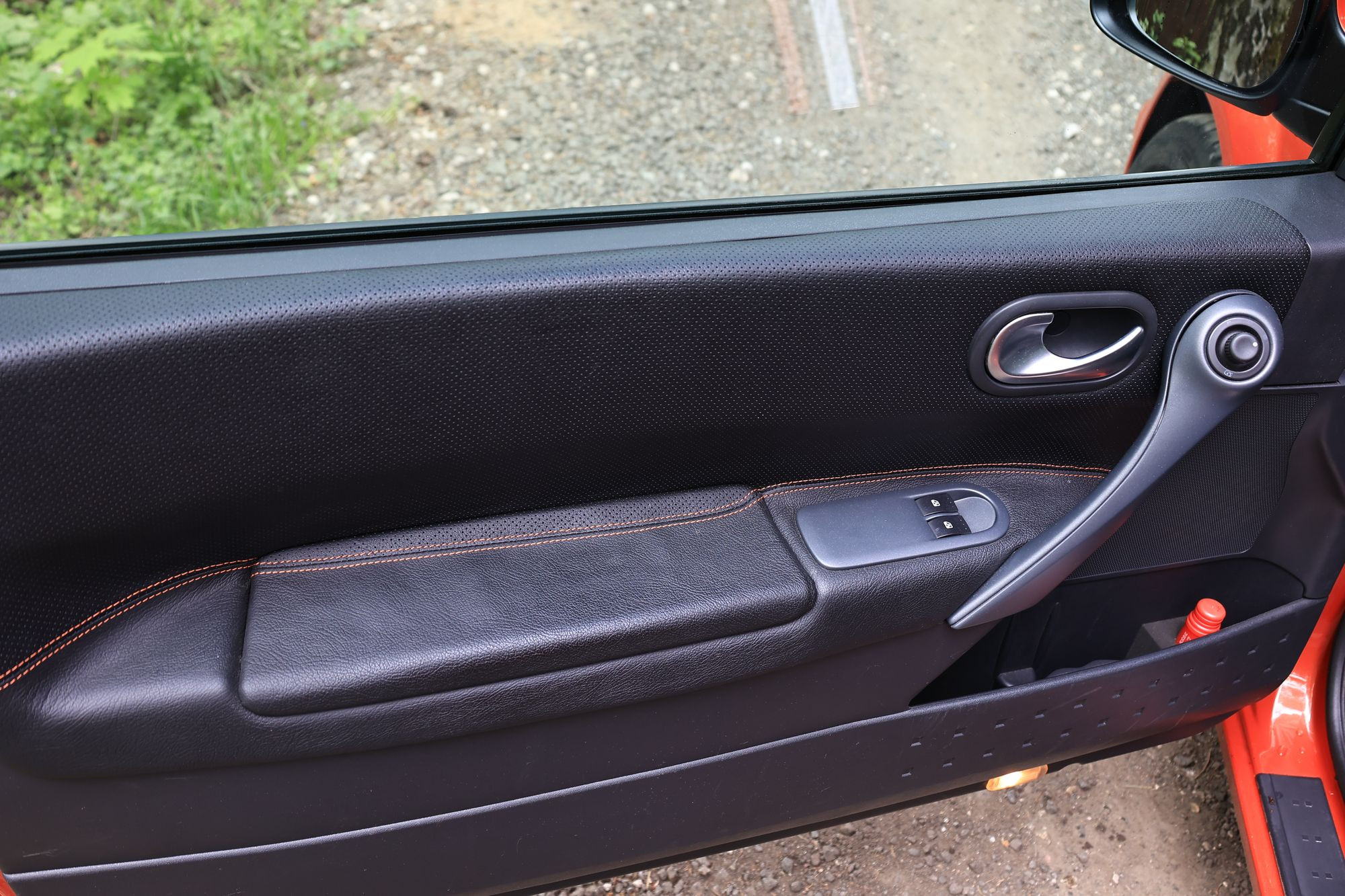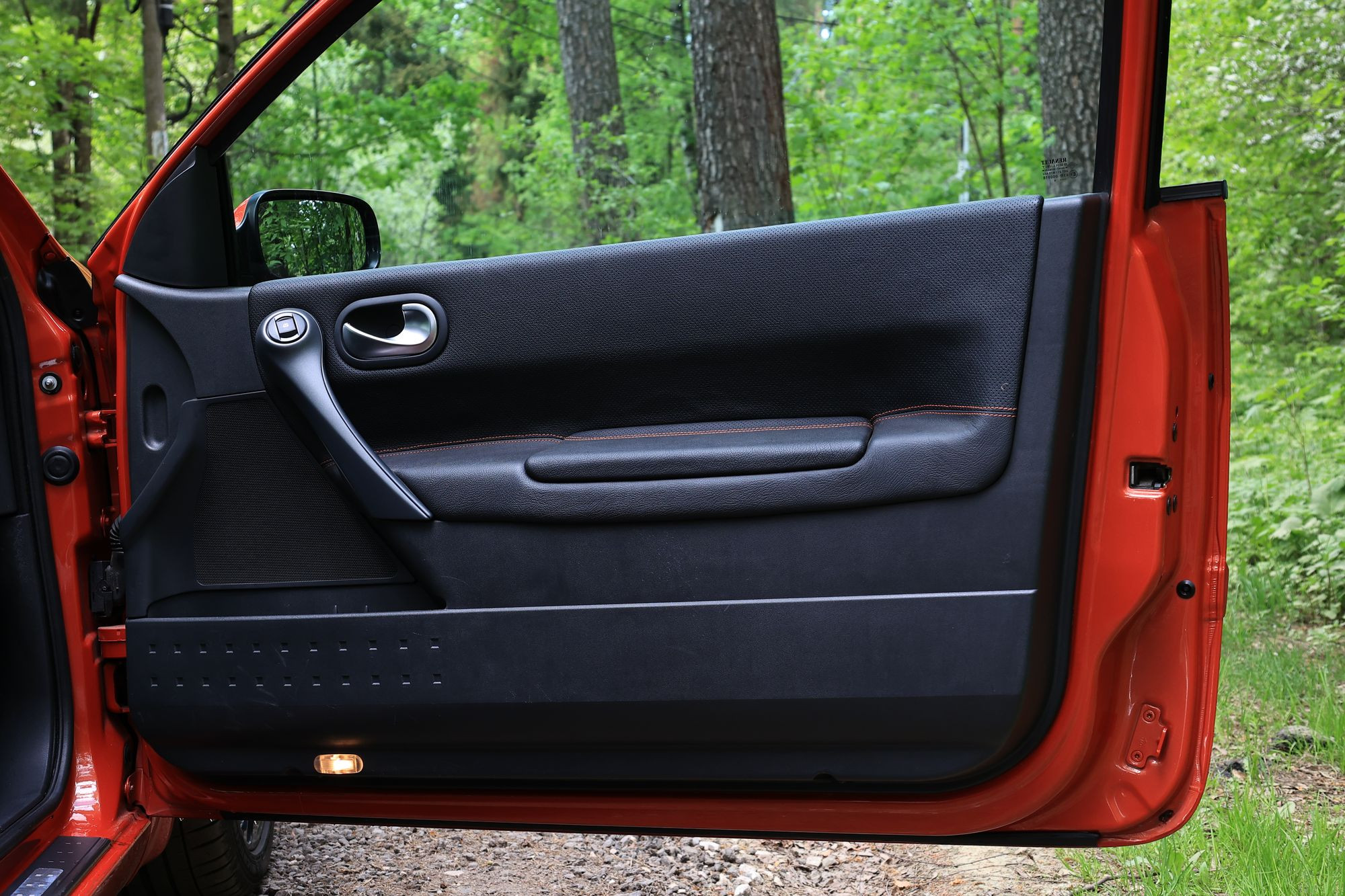 Сиденья не перешивались – только реставрировались. Дверные карты перешивались с минимальными отличиями – в ту же самую перфорированную кожу, но с оранжевой строчкой, в отличие от оригинала. Перешивался потолок, восстанавливалась кое-где пластмасса интерьера, поскольку она сильно деградирует на солнце.