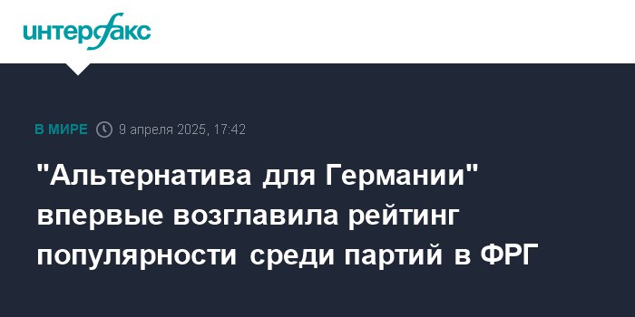Ультраправая партия "Альтернатива для Германии" (АдГ, AfD) впервые в своей истории возглавила рейтинг популярности политических сил в стране, сообщают европейские СМИ со ссылкой на опрос Ipsos, проведенный 4-5 апреля среди примерно тысячи человек.