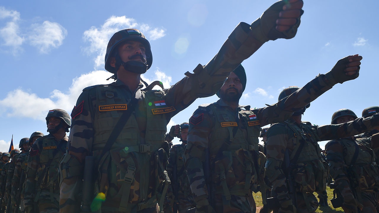 Лейтенант Сухопутных войск индийской армии Ша Шрадаха - единственная здесь девушка-знаменосец. Со своей весомой задачей справилась на отлично. Торжественный марш открывают хозяева учений. Под звуки сводного оркестра Восточного военного округа, чеканя шаг, российские военнослужащие задают общий ритм.