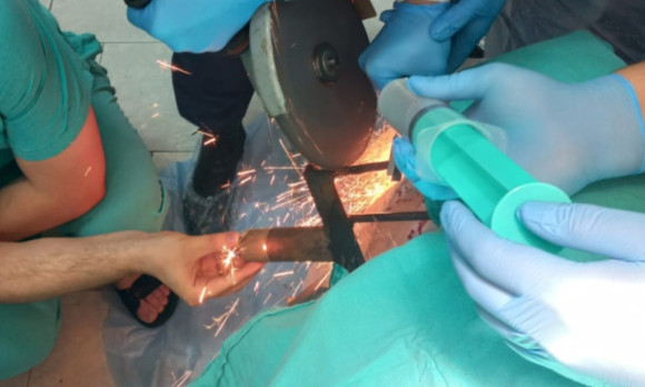 Спасатели, действуя с ювелирной точностью, отпилили рукоятку вил и разъединили зубья сельскохозяйственного инструмента. После того как в голове пострадавшего осталось только несколько металлических зубьев, за дело взялись хирурги.