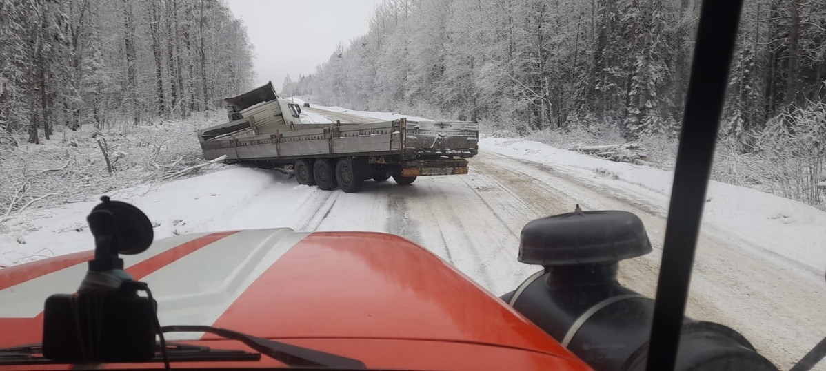 Фура вылетела в кювет и перекрыла трассу в Карелии