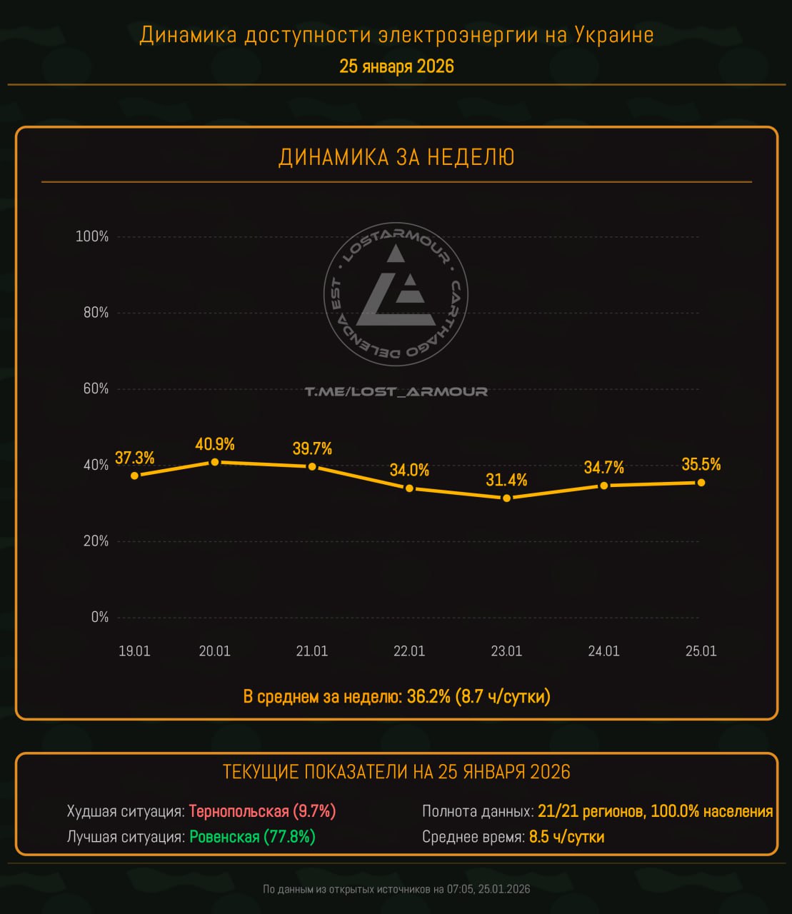 Инфографика доступности электроэнергии на территории Украины по областям на 25 января 2026.