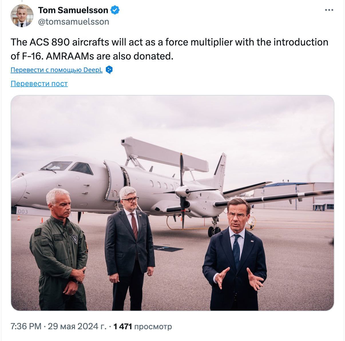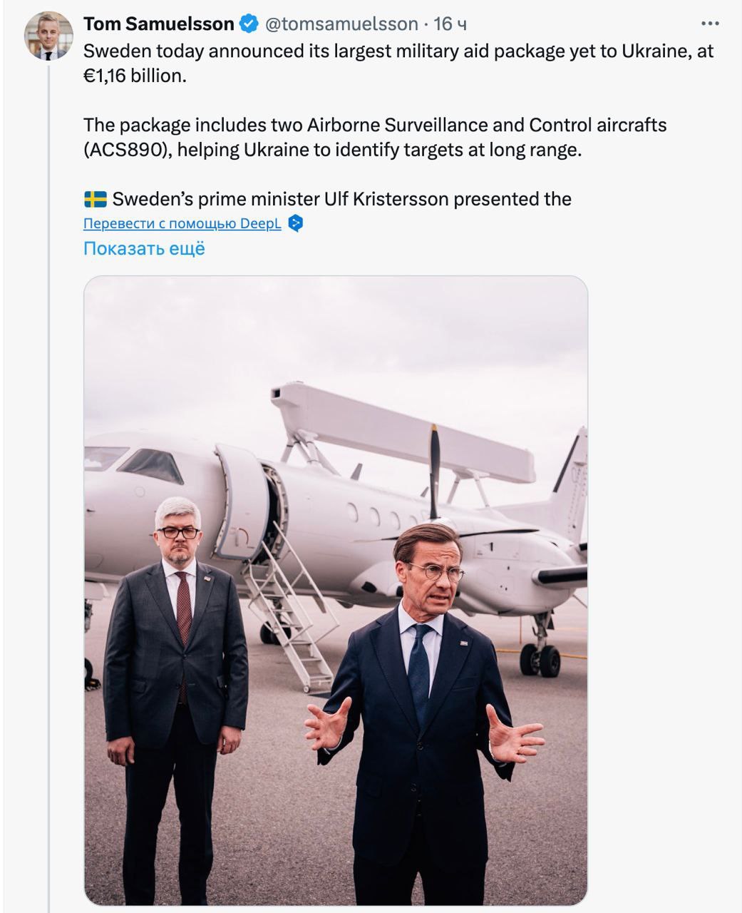 "В пакет входят два самолета воздушного наблюдения и управления (ACS890), которые помогут Украине идентифицировать цели на большом расстоянии", - написал в Х представитель шведского премьера Том Самуэльссон.