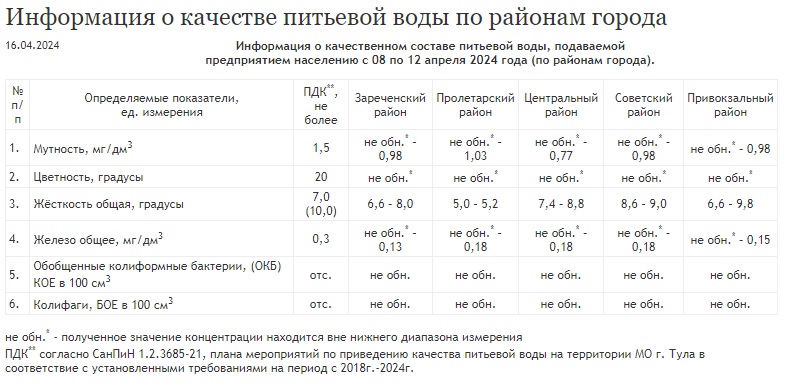 Так, с 8 по 12 апреля 2024 года максимальная жесткость воды была зафиксирована в Привокзальном и Советском округах Тулы, а максимальная мягкость — в Пролетарском.