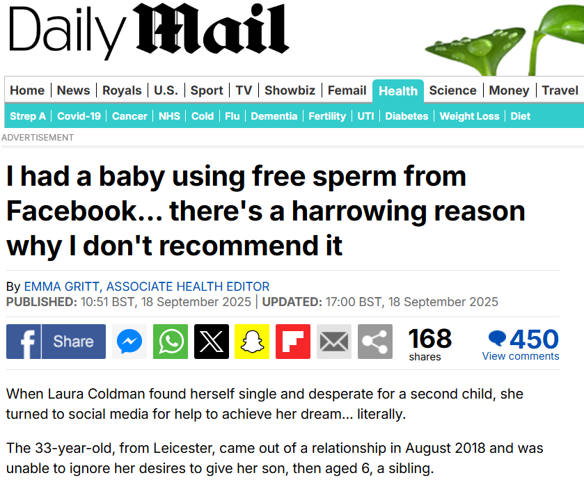 Всё началось с истории 33-летней Лоры Колдман из Лестершира, офицера связи, которая после развода решила завести второго ребёнка. Не найдя партнёра, она обратилась к группам в Facebook*, где мужчины предлагали свою сперму бесплатно. Такие группы существуют уже несколько лет, и многие женщины видят в них способ избежать дорогих процедур вроде ЭКО, которые стоят тысячи фунтов.