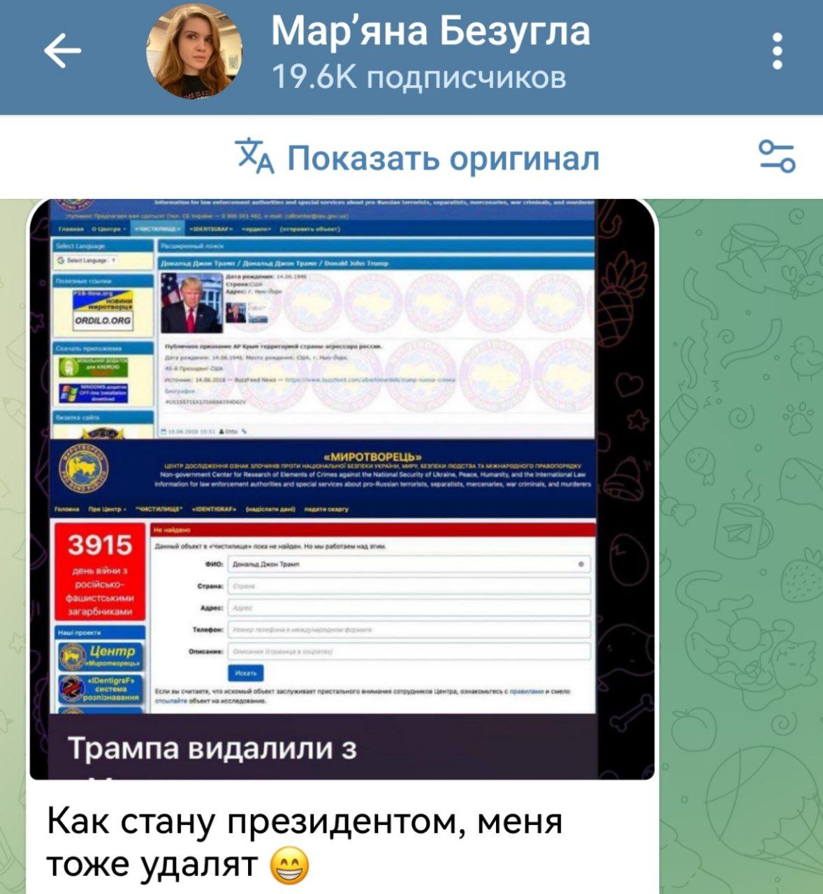 Украина удалила Трампа с сайта "Миротворец", — рассказала депутат рады Марьяна Безуглая.