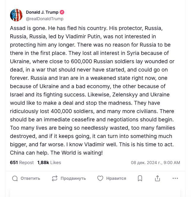 Дональд Трамп выкатил пост в своей соцсети и собрал дайджест по геополитике в одном абзаце. По пунктам: