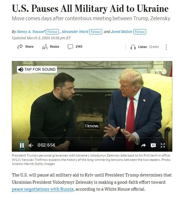🔹Приостановка США помощи Киеву: