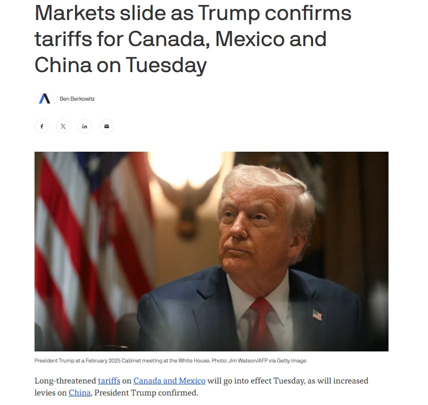 Axios: Пошлины, как ожидается, спровоцируют торговую войну с тремя крупнейшими торговыми партнёрами США, что может привести к повышению цен на широкий спектр товаров для американских потребителей.
