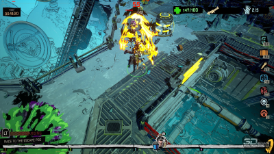 Несмотря на то же место действия, атмосфера в [REDACTED] абсолютно иная. Намеки на ужастик остались лишь в дизайне монстров. По настроению она, внезапно, напоминает скорее Hi-Fi Rush или Sunset Overdrive. И дело не столько в комиксовой стилистике, сколько в бунтарском, панковом настрое. Саундтрек состоит из зажигательного гаражного рока, диалоги (вернее, монологи загадочного Наблюдателя и соперников за место в капсуле) полны черного юмора. Никаких попыток казаться серьезной. И это игре к лицу.