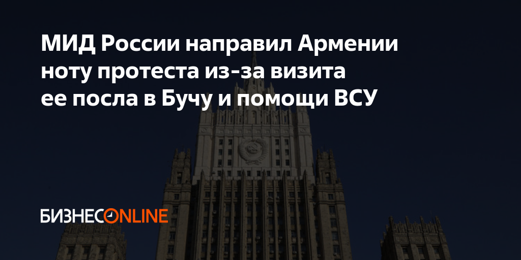 МИД России направил Армении ноту протеста в связи с передачей помощи на нужды вооруженных сил Украины в ходе посещения Бучи делегацией Еревана. Об этом сообщает РИА «Новости» со ссылкой на официального представителя министерства иностранных дел Марию Захарову.