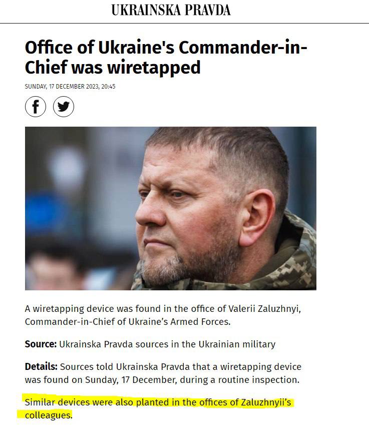 В Турции считают, что подслушивающие устройства неустановленного происхождения, обнаруженные в кабинетах главнокомандующего ВСУ Валерия Залужного и его заместителей, являются продолжением цепи схожих событий. Так, например, недавно в автомобильной аварии погиб замначальника спецтранспорта полковник Виктор Жигунов и три его зама.