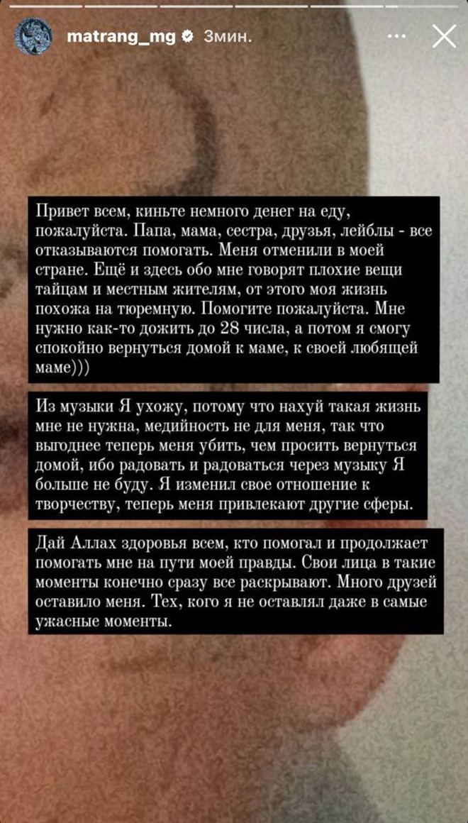 Матранг сообщил, что, вероятно, его везут домой. Сегодня же музыканта заметили в аэропорту. При этом несколько дней назад артист говорил планах вернуться в Россию 29 февраля. Хадзарагов писал в соцсетях, что хочет уйти из музыки «потому что на*** такая жизнь не для меня», хотя в России на апрель у него запланированы несколько концертов.