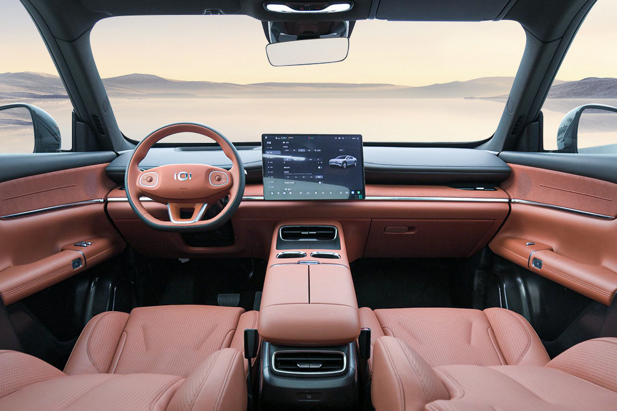 В пятиместном салоне отсутствует привычная приборка – ее роль возложена на проекционный дисплей. Нет и отдельного блока управления «климатом» — все настройки «вшиты» в гигантский центральный тачскрин мультимедийной системы. За управление трансмиссией отвечает подрулевой рычажок. Между тем китайским СМИ уже удалось сделать фото «живых» машин, так вот на них видно, что в пассажирский солнцезащитный козырек вместо зеркала может быть встроен дополнительный дисплей. В списке оборудования еще заявлены беспроводная зарядка для смартфона, стеклянная крыша, обогрев руля, подогрев и вентиляция всех кресел (у передних сидений также есть массажер).